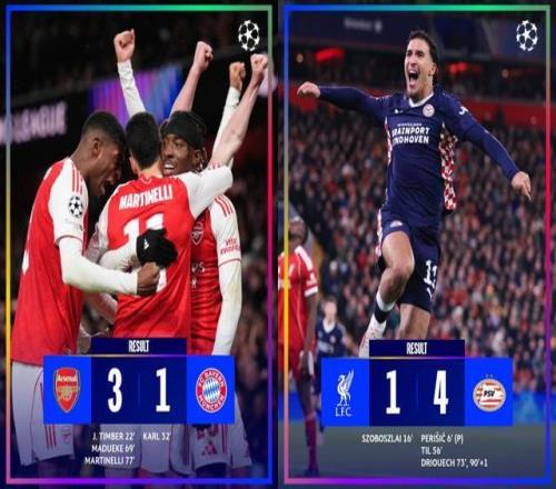 阿森纳3-1战胜拜仁,豪取欧冠5轮全胜登顶。利物浦1-4惨败荷甲球队,巴黎5-3热刺踢疯了上演进球大战,皇马4-3赢球姆巴佩大四喜!