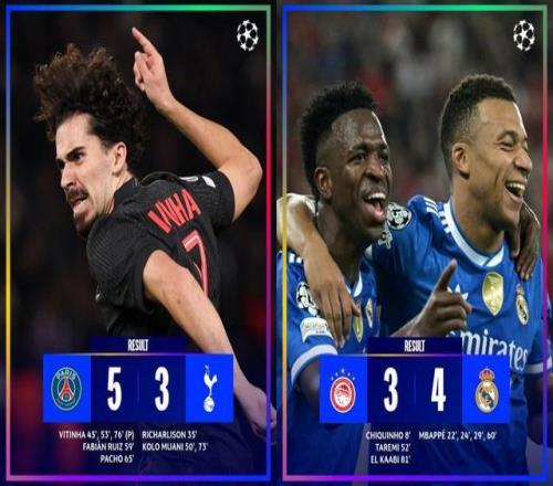另一边,上赛季欧冠冠军巴黎迎战热刺。维蒂尼亚上演帽子戏法,法比安、帕乔和穆阿尼进球,里沙利松首开纪录和穆阿尼梅开二度,最终巴黎主场5-3取胜积12分排在第2,热刺积8分位列第16。