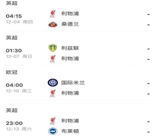 更令利物浦球迷绝望的是,在进入12月份之后,红军将迎来一个魔鬼赛程,在12月4号到12月13号这短短9天内,他们要踢4场比赛,每场比赛的间隔时间平均下来甚至还不到3天。