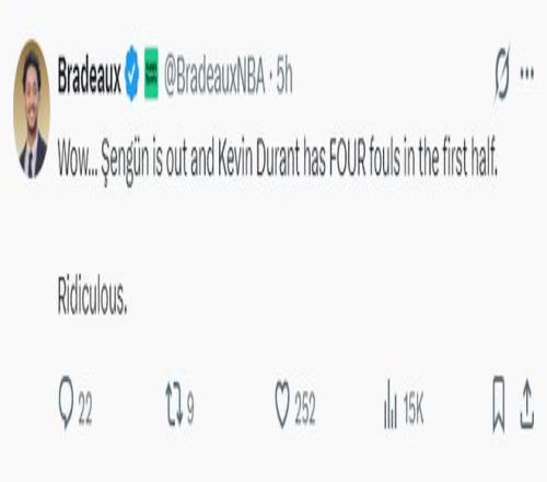 火箭记者Bradeaux写道:开场我们就折损了申京,而杜兰特半场就吃下4个犯规,太荒谬了。