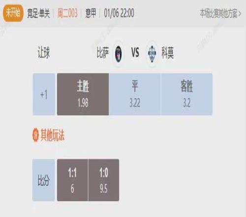 初始科莫客让0.75高位起步,后市客队继续拉升;两队本赛季成绩差距较大,但给到客场0.75的让步未免有些托大,毕竟老牌劲旅尤文在客场也只让一球,虽然科莫最近两个赛季实力提升明显且本场前场核心帕斯复出,但比萨不败率不错且保级战意具备,意味夸大客队优势并一路走高添利的动作并不合理,欧洲方面,目前平局也处于3.45的相对低位,因此综合考虑,本场看好比萨主场爆冷不败。