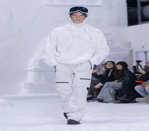 有趣的是,品牌还将灵感目光溯源至中国阿勒泰的滑雪运动起源,古老岩画描绘的滑雪图腾、阿尔泰山脉的雄浑线条、层层交织的冰川纹理与现代数字印花相结合,打造出跨越历史与未来的时尚风格。