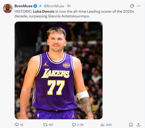 湖媒:东契奇刚刚完成了湖人队史最快三双纪录,这个纪录不是来自在湖人效力13个赛季的魔术师,也不是在湖人效力8个赛季的勒布朗,更不是在湖人效力20赛季的科比,而是仅仅代表湖人出战67场的卢卡。