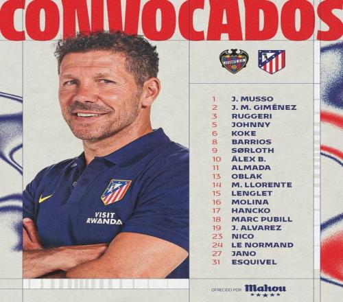 北京时间1月31日,马德里竞技宣布了本周末西甲第22轮他们做客挑战莱万特的大名单,在格列兹曼和朱利亚诺-西蒙尼受伤的情况下,他们一线队的非门将球员仅剩16人。