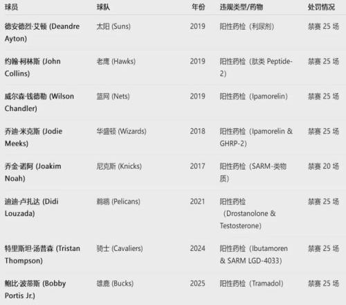 违反联盟禁药条例的处罚比较重,一般要禁赛20场以上。2025年2月21日,雄鹿内线波蒂斯被禁赛25场。再往前看,2024年1月24日,特里斯坦-汤普森被禁赛25场。光是2019年,艾顿、约翰-科林斯、威尔森-钱德勒等全被禁赛25场。
