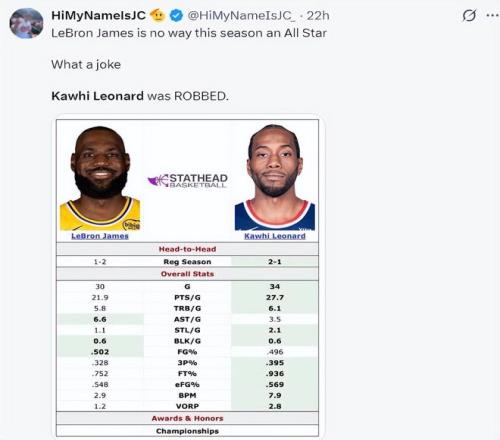 快船媒体晒出詹姆斯、伦纳德的数据对比,伦纳德还比詹姆斯多打4场比赛!
